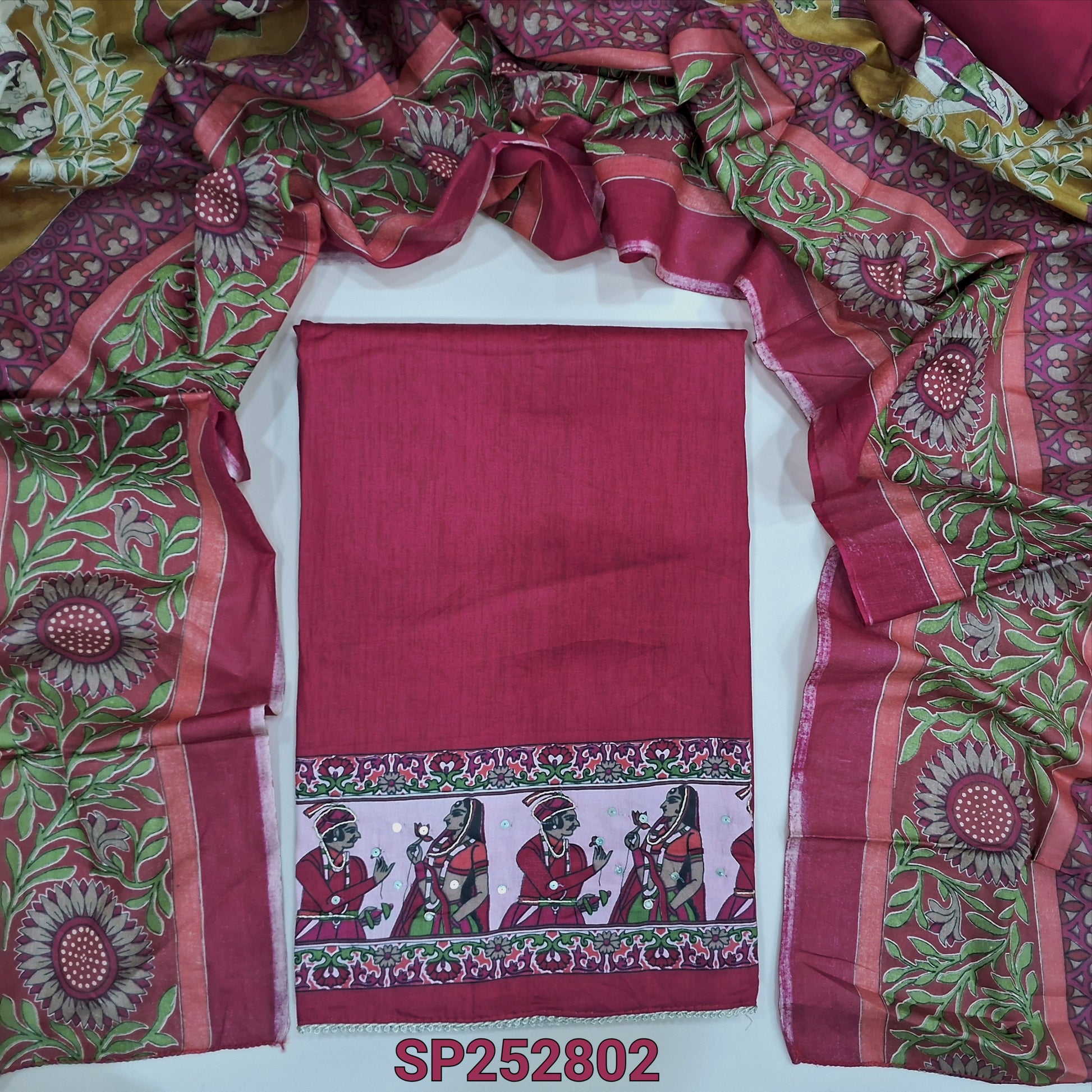 Dark Pink digital printed fancy silk cotton unstitched salwar material, printed daman with bead work (Soft, Lning Needed) matching spun cotton bottom, pure cotton printed dupatta. SP252802