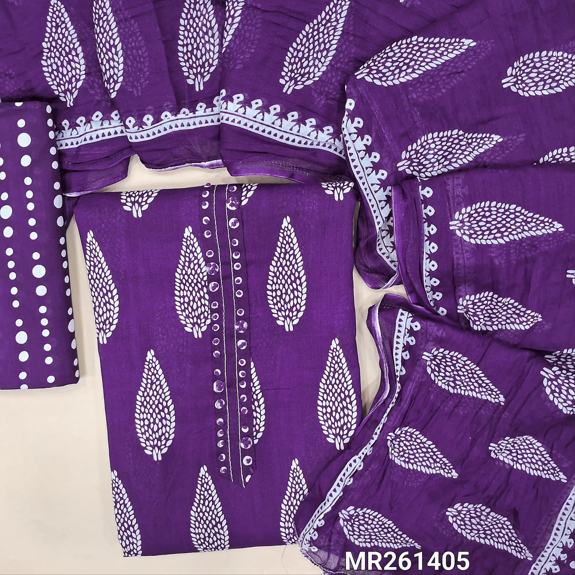 Dark purple pure soft cotton unstitched salwar material(thin,lining optional) french knot work on yoke,printed all over, printed cotton bottom, printed crinkled pure soft cotton dupatta. MR261405