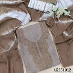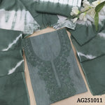 Denim blue handloom cotton unstitched salwar material, self embroidered on yoke& front(lining optional)shibori dyed cotton bottom, shibori dyed pure mul cotton full length dupatta. CODE AG251010