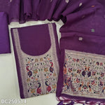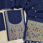 Black designer premium silk cotton unstitched salwar material, paithani weaving on yoke & daman(lining needed)matching silk cotton bottom, jamdani woven premium silk cotton dupatta with paithani weaving pallu.DC250516