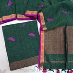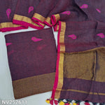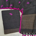 Designer black pure linen jamdani unstitched salwar material (lining needed) hand woven design on front, zari lines on daman, NO BOTTOM, jamdani woven pure linen dupatta with zari lines pallu & tassels. NV252613