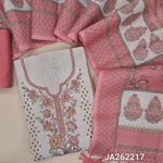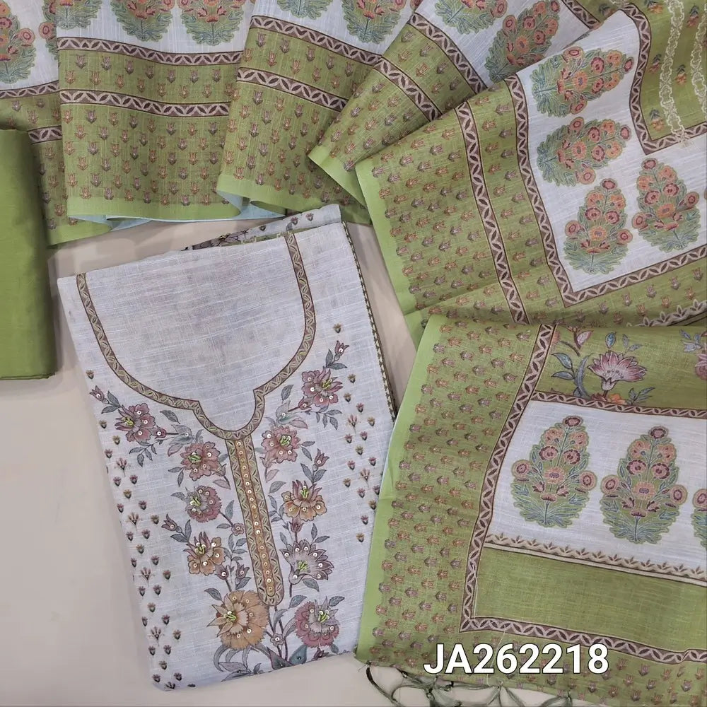 Designer floral printed pastel Green tissue silk cotton unstitched salwar material(lining needed)half white panel design, thread work on daman, matching silky bottom, printed tissue silk cotton dupatta with tassels. JA262218