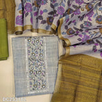 Designer light Grey premium silk cotton unstitched salwar material (lining needed) floral print, gota work on yoke, blueish grey santoon bottom, floral printed premium silk cotton dupatta. DC253104