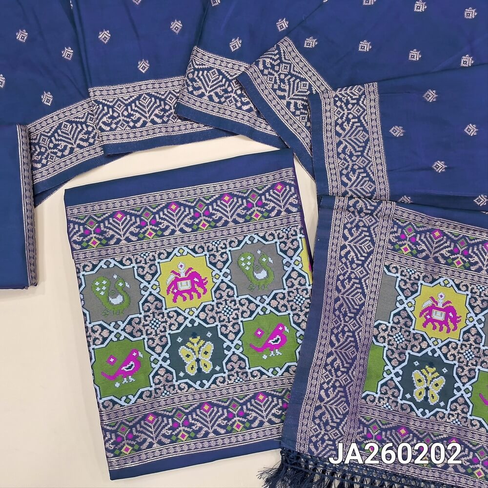 Designer royal Blue premium silk unstitched salwar material (lining needed) meenakari weaving patola design on daman, matching silk bottom with zari borders, premium silk cotton full length dupatta with meenakari weaving design pallu. JA260202