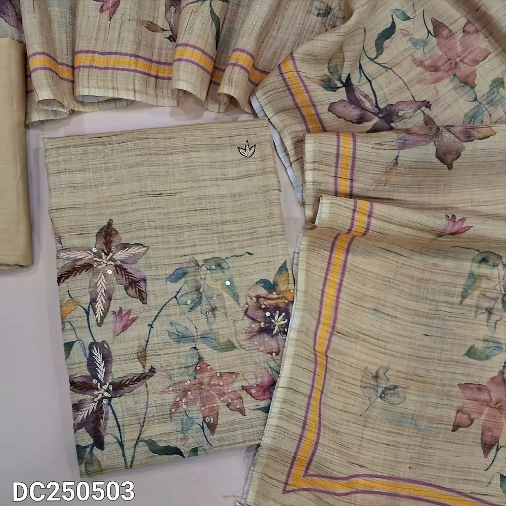 Beige premium semi linen unstitched salwar material(lining needed) digital print, embroidery work on daman, matching cotton bottom, digital printed semi linen full length dupatta. DC250503
