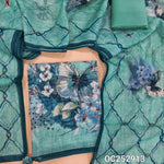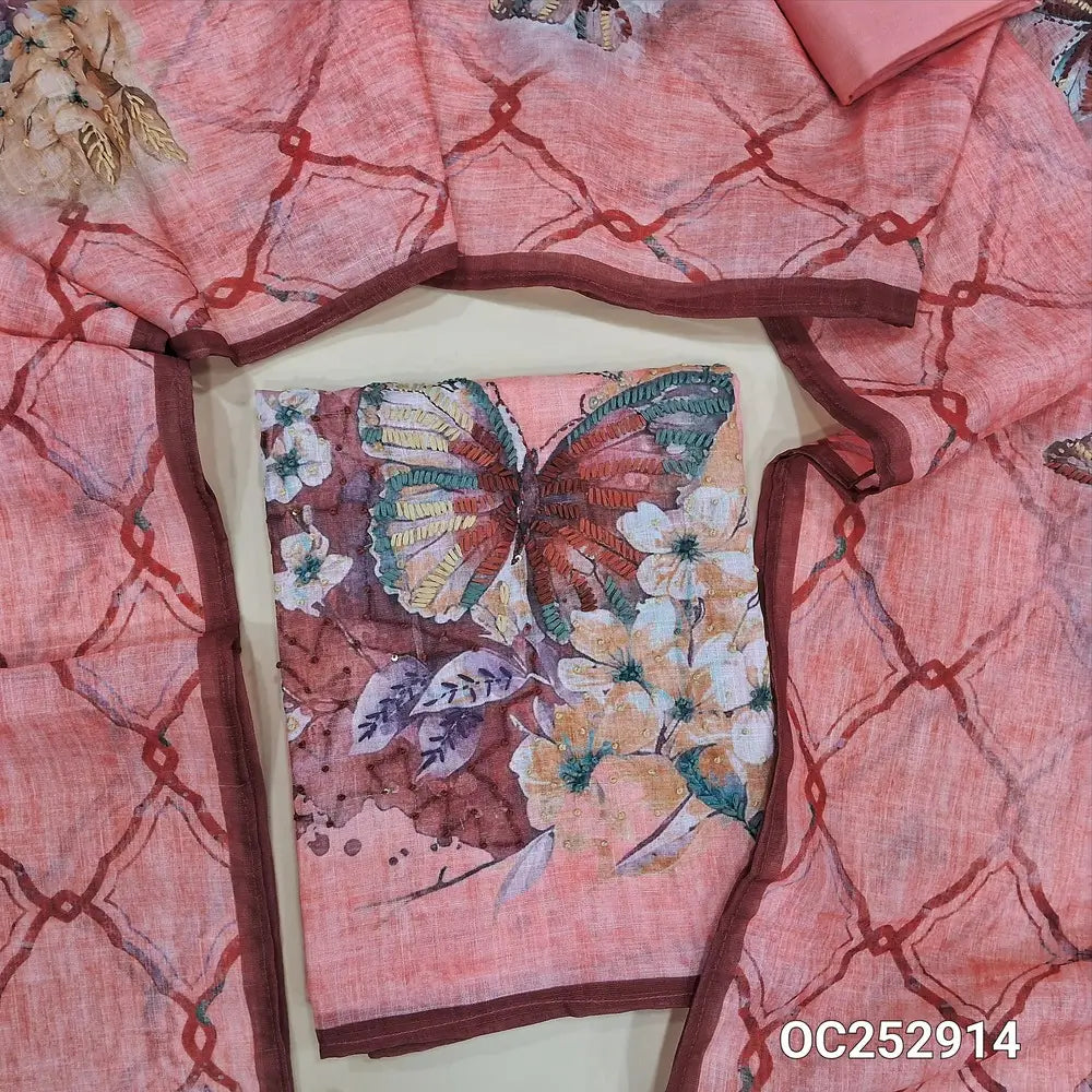 Bright pink digital printed premium linen unstitched salwar material,(textured, lining needed) hand embroidery on daman, V neck, matching santoon bottom, digital printed , embroidery work on premium linen dupatta. OC252914