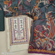 Half White premium tissue silk unstitched salwar material (lining needed) digital print, embroidery work on yoke, dark grey silky bottom, digital kalamkari printed silk cotton full length dupatta. DC251207