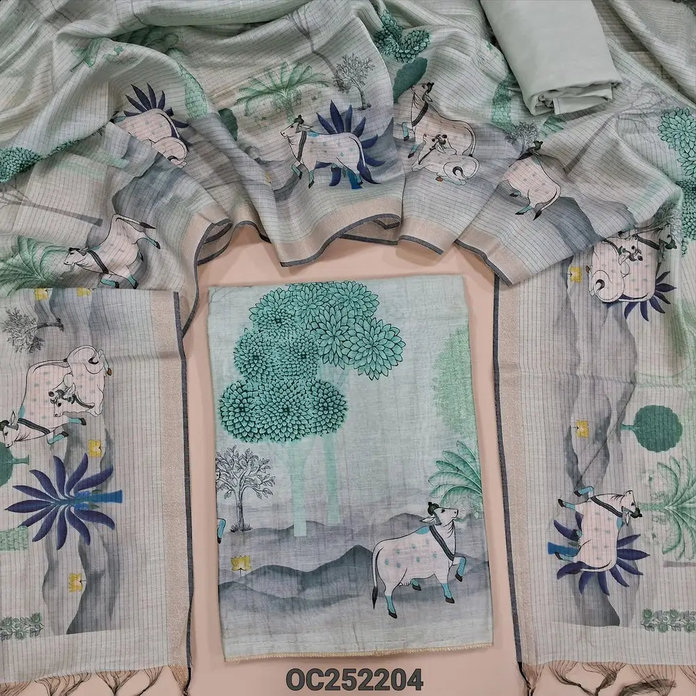 Digital printed pale Green silk cotton unstitched salwar material (thin, lining needed) pichwai printed in daman, matching santoon bottom, pichwai printed soft silk cotton dupatta. OC252204