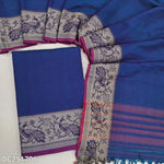 Dual shade turquoise Blue south mercerized handloom cotton unstitched salwar material(thin, lining needed)contrast peacock thread woven border, bottom included with top, mercerized handloom cotton dupatta with thread woven borders & tassels. DC251709