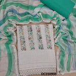 Half White glazed cotton unstitched salwar material (soft, lining needed) colorful print, heavy embroidery work on front, blue cotton bottom, brush paint chiffon dupatta with lace tapings. DC250905