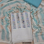 Half White glazed cotton unstitched salwar material (soft, lining needed) colorful print, heavy embroidery work on front, turquoise blue cotton bottom, brush paint chiffon dupatta with lace tapings. DC250908