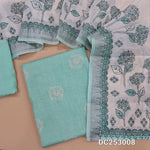 Pastel Green semi linen unstitched salwar material (textured, lining needed) floral embroidery on front, matching santoon bottom, floral printed semi linen dupatta. DC253009