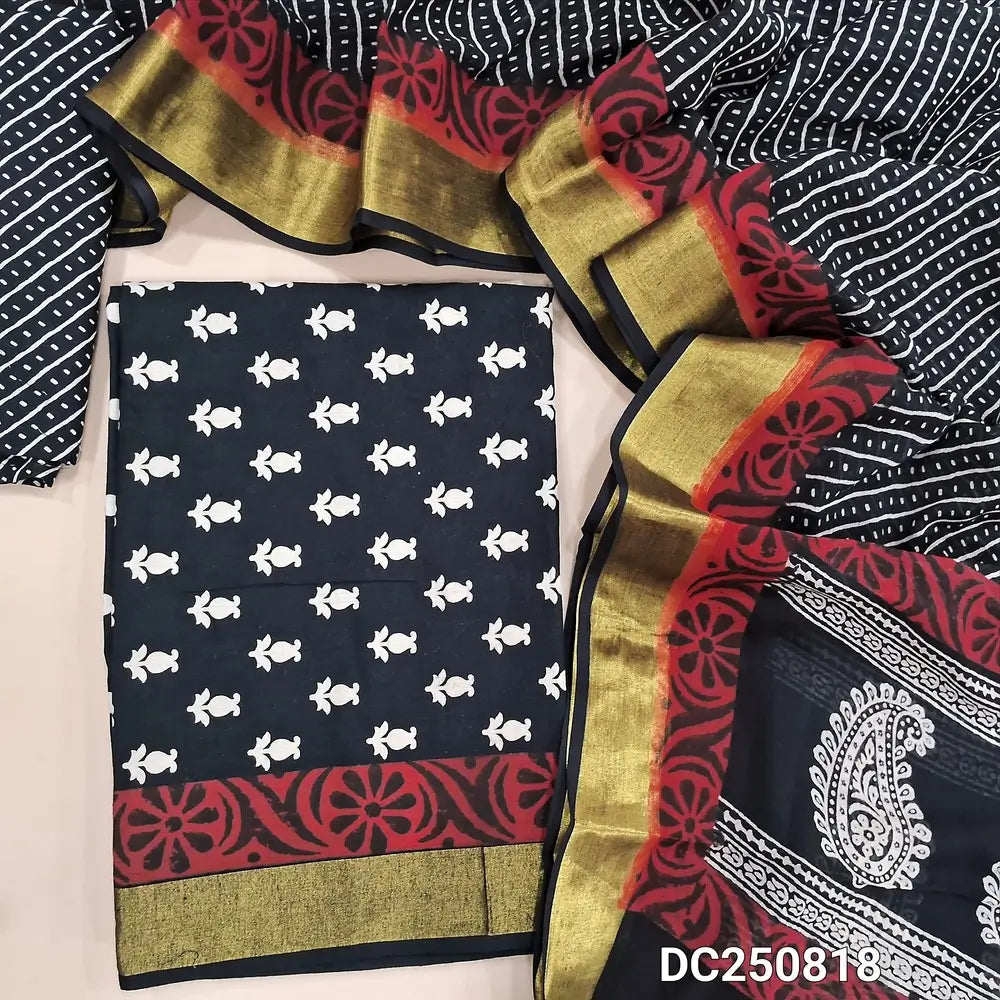 Floral printed Black cotton unstitched salwar material (soft, lining needed) golden borders on daman, printed cotton bottom, printed cotton full length dupatta with bolden borders. DC250818 (TAPING NEEDED)