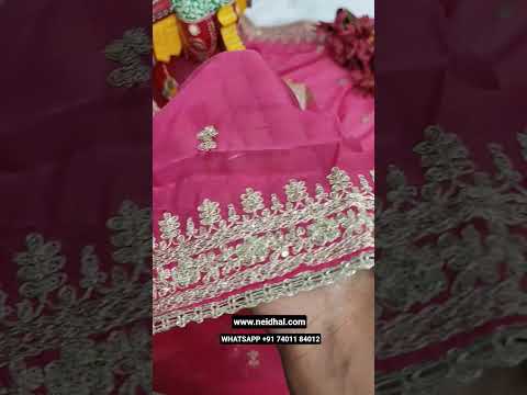 Pink floral printed pure organza unstitched salwar material, v neck, zari& sequins work on yoke& front(thin, lining needed)matching santoon bottom, pure organza short width dupatta with sequins work. CODE JL251918