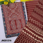 Green ajrak printed pure soft cotton unstitched salwar material, thread& faux mirror work on yoke(lining optional)mehandhi yellow vertical printed cotton bottom, printed pure soft cotton dupatta(REQUIRES TAPINGS). CODE JN251215