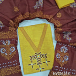 Green premium handloom cotton unstitched salwar material, V neckline and applique work on yoke (Thin, Lining Needed) beetroot purple cotton bottom, handblock printed mul cotton dupatta. NV251512