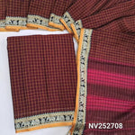 Mossy Green mercerised handloom cotton unstitched salwar material, checked all over, double side borders (Thin, Lining Needed) Fabric Measurement : 4.5 Metres, Full length dupatta. Note : Weaving Inconsistencies are not defects. NV252707