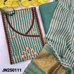 Dark green premium satin cotton unstitched salwar material, angraha neck with real mirror work(lining optional)maroon drum dyed cotton bottom, batik dyed fancy soft silk cotton dupatta with gold tissue pallu. CODE JN250110