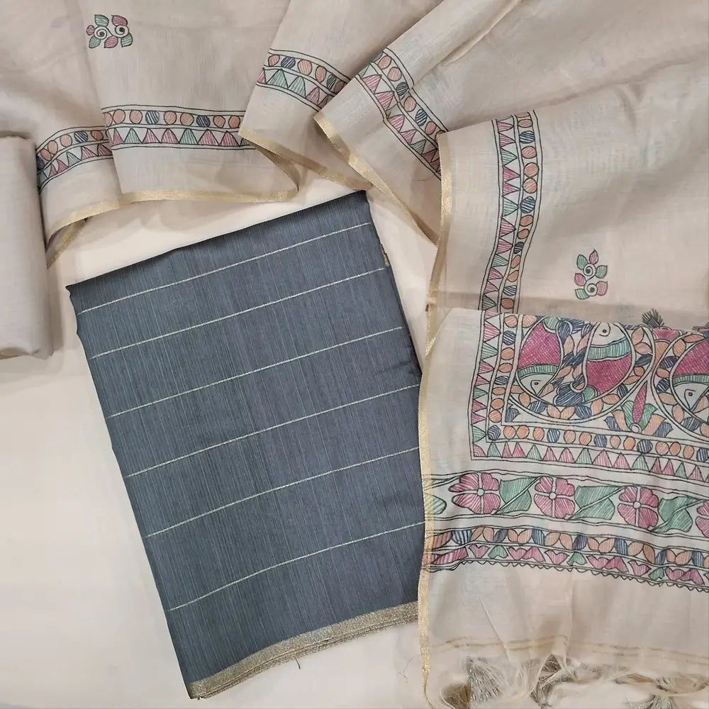 Grey fancy art silk unstitched salwar material (textured, lining needed) zari lines all over, beige silky bottom, digital printed fancy silk cotton dupatta. JA261704