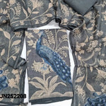 Dark grey digital printed premium linen unstitched salwar material, hand embroidered on front(thin, lining needed)matching santoon bottom, digital printed pure linen full length dupatta with hand work. CODE JN252207