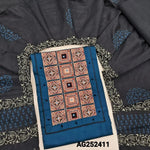 Dark grey jam cotton unstitched salwar material, ajrak yoke patch with thread& faux mirror work(lining optional)maroon pure cotton bottom, block printed fancy silk cotton dupatta(lining optional). CODE AG252412