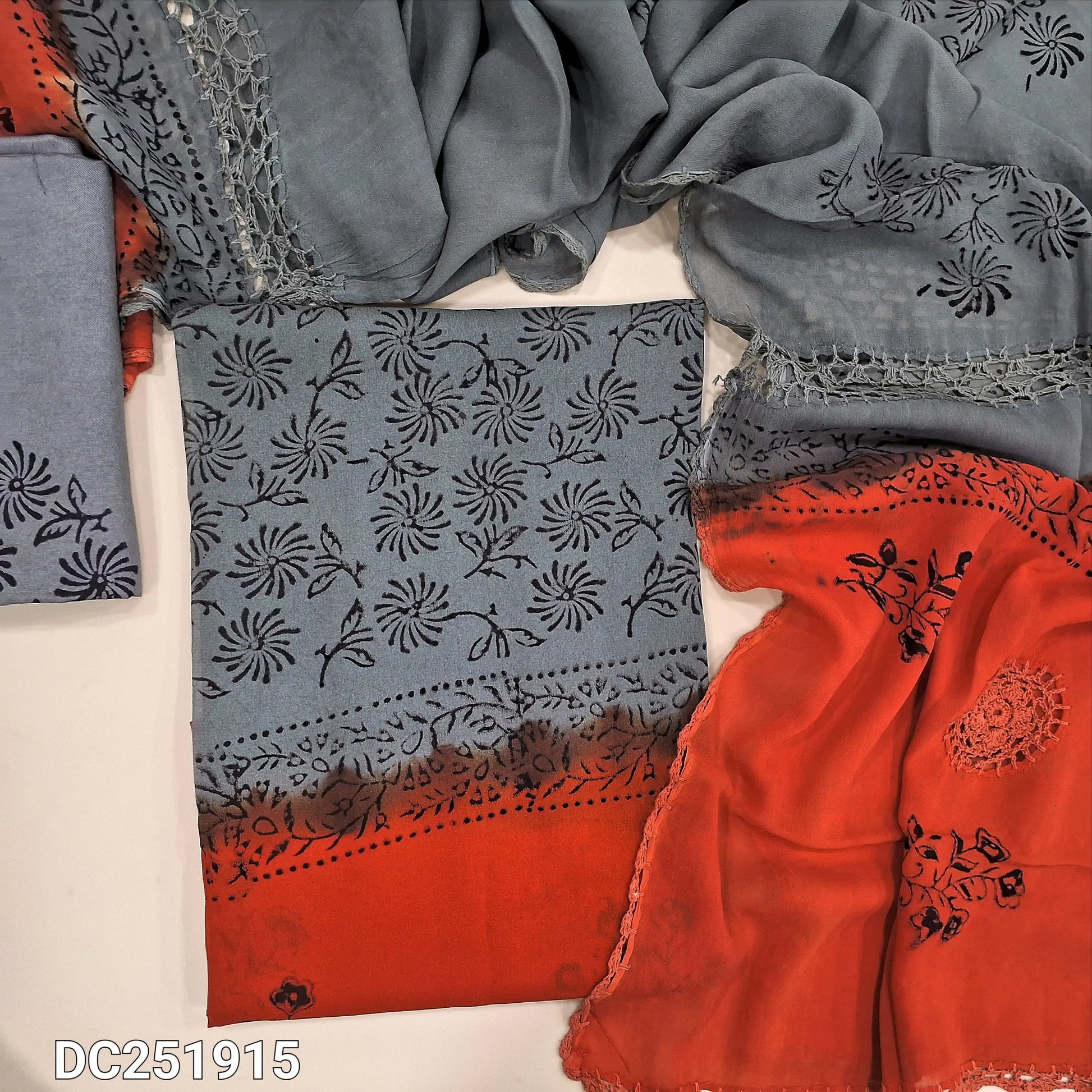 Grey & bright Orange crepe georgette unstitched salwar material (lining needed) hand block printed allover, santoon bottom, crochet work on dual shade chiffon dupatta (TAPING NEEDED). DC251915 (over lapping of prints not consider as a defect