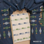 Half white base slub silk cotton unstitched salwar material, blue and pink thread weaving design all over(thin, lining needed) blue silk cotton bottom, jamdani woven silk cotton dupatta. NV252117