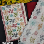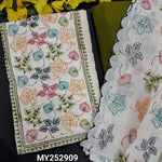CODE MY252909 : Half white block printed schiffli embroidered pure cotton unstitched salwar material, embroidered on yoke(lining needed)mossy green cotton bottom, block printed pure mul cotton dupatta with embroidery& scallop edges.