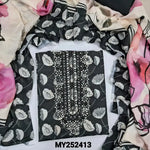 Half white brasso silk cotton unstitched salwar material, embroidered on yoke(lining needed)matching santoon bottom, digital printed soft silk cotton dupatta. CODE MY252414