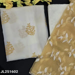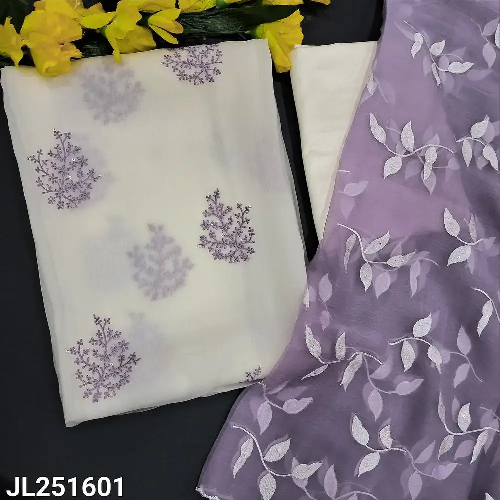 Half white chiffon organza unstitched salwar material, lavender embroidered on yoke(thin, lining needed)matching silky fabric provided for both bottom& lining, rich embroidered fancy chiffon organza dupatta with scallop edges. CODE JL251601