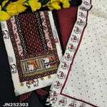 Half white base elephant printed soft cotton unstitched salwar material, ajrak printed yoke with hand embroidered(lining needed)black cotton bottom, printed soft mul cotton dupatta with printed borders. CODE JN252304