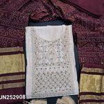 Half white fancy silk cotton unstitched salwar material, rich zari& sequins work on yoke(thin, lining needed)bright pink santoon bottom, bandhini printed pure soft cotton dupatta with gold tissue pallu. CODE JN252910