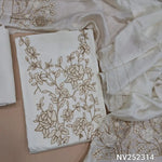 Half white satin cotton unstitched salwar material, embroidery work on front (lining needed) matching spun cotton bottom, soft fancy silk cotton dupatta with rich embroidery (TAPINGS NEEDED). NV252314