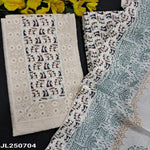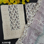 Half white schiffli embroidered cotton unstitched salwar material, warli printed on yoke(lining needed)warli printed cotton bottom, block printed pure cotton dupatta with printed tapings. CODE JL250702