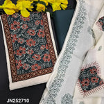 Half white schiffli embroidered cotton unstitched salwar material, floral printed yoke with sequins work(lining needed)black cotton bottom, block printed pure mul cotton dupatta with applique work. CODE JN252709