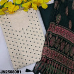Half white schiffli embroidered pure cotton unstitched salwar material, faux mirror work on yoke(lining needed)dark wine purple cotton bottom, printed crinkled chiffon stole like dupatta with tassels. CODE JN2508091