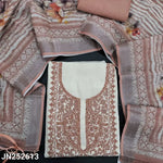 Half white semi linen unstitched salwar material, embroidered& bead work on yoke, faux mirror work on front(thin, lining needed)blue silky bottom, digital printed semi linen dupatta with fancy tassels. CODE JN252610