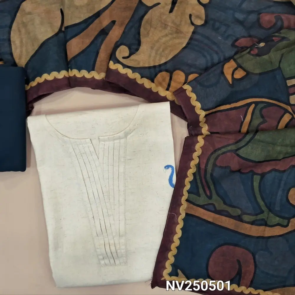 Half white soft flex cotton unstitched salwar material (Lining optional) simple embroidery on front, round notch neck, bluish grey cotton bottom, colorful kalamkari printed stole. NV250501