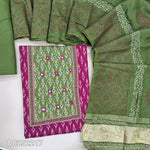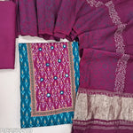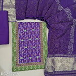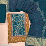 Ikat printed mehandhi Yellow soft cotton unstitched salwar material (lining optional) real mirror, printed on yoke, teal blue spun cotton bottom, block printed fancy silk cotton dupatta with tissue border pallu. DC252219