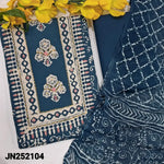 Indigo blue original wax batik premium satin cotton unstitched salwar material, hand embroidered on yoke(lining needed)matching drum dyed lining provided, NO BOTTOM, printed pure chiffon short width dupatta(REQUIRES TAPINGS). CODE JN252106