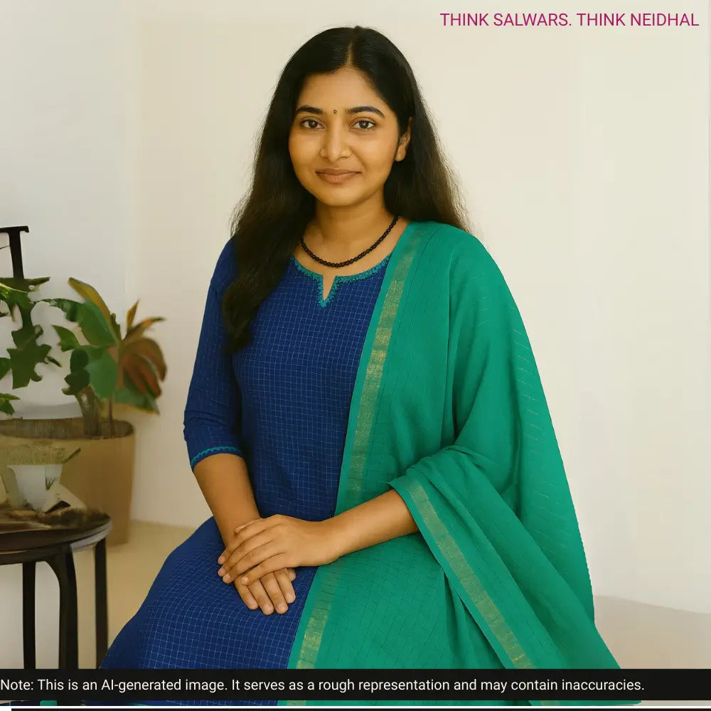 Ink blue south handloom cotton unstitched salwar material(lining needed)turquoise green handloom cotton bottom, self checkered handloom cotton dupatta with zari borders. CODE AG252906