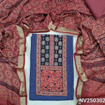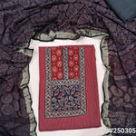 mehandhi yellow cotton unstitched salwar material (lining optional) kantha stitch on front, ajrak patch work on yoke, black cotton bottom, ajrak printed cotton dupatta. NV250305