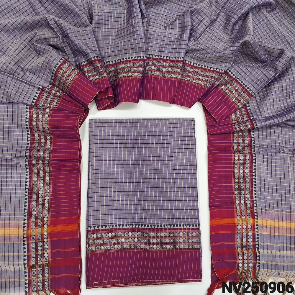 Lavender south mercerized handloom cotton unstitched salwar material(thin, lining needed) checked allover with contrast traditional thread woven border, bottom included with top, checked mercerized handloom cotton dupatta with tassels. NV250906