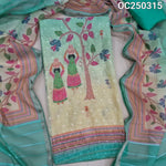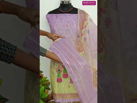 Lavender with yellow digital printed slub silk cotton unstitched salwar material, rich daman with handwork (Textured, Thin, Lining Needed) Matching bottom, Digital Printed Short Width Dupatta. OC250318