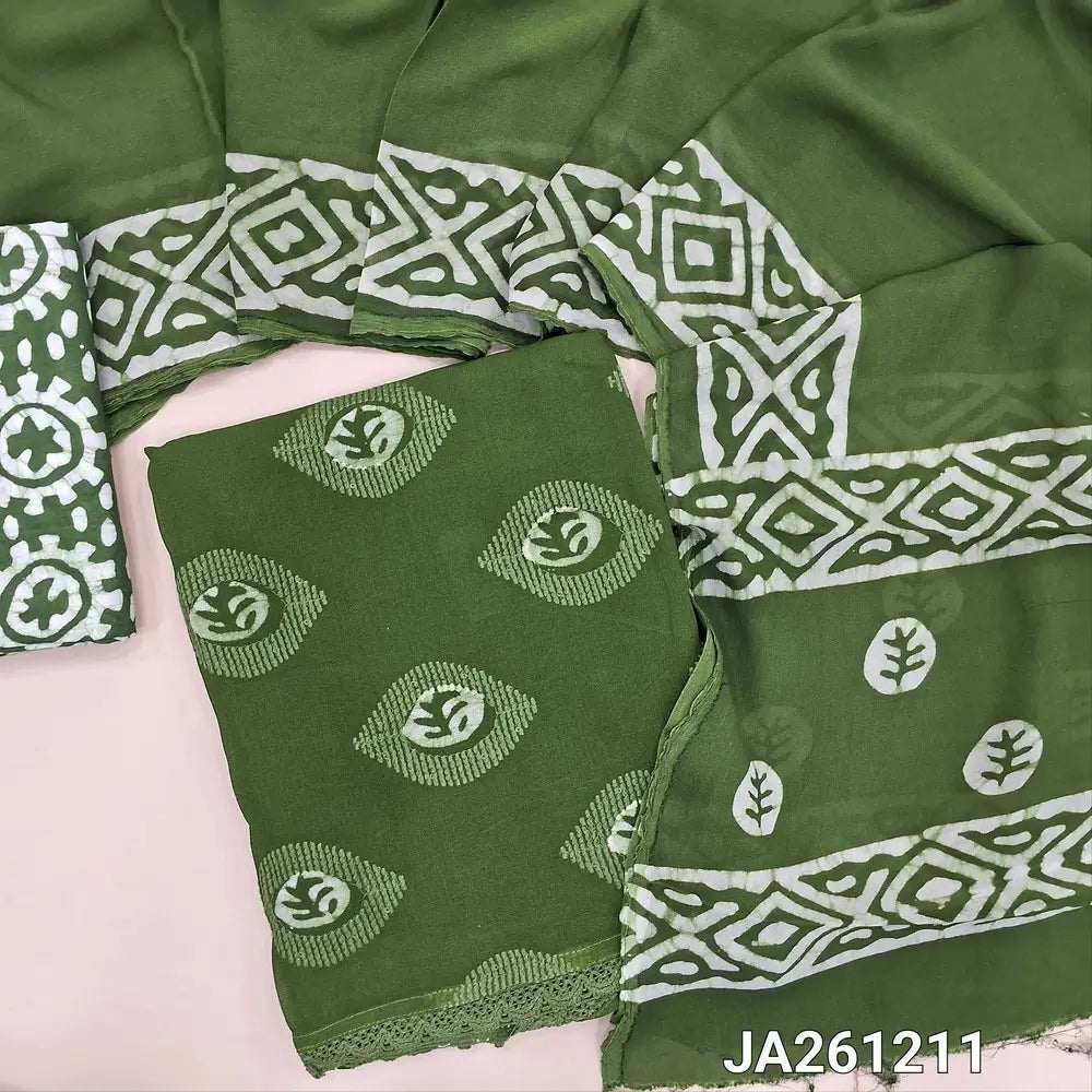 Leafy Green crepe georgette unstitched salwar material (flowy, lining needed) thread, batik design on front, matching batik dyed santoon bottom, batik dyed crepe georgette dupatta (TAPING NEEDED). JA261211