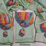 Light greyish beige designer digital printed premium linen unstitched salwar material, v neck, hand embroidered on front(thin fabric, lining needed)matching santoon bottom, digital printed pure linen dupatta with hand embroidered. SP252523