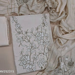Light beige satin cotton unstitched salwar material, embroidery work on front (lining needed) matching spun cotton bottom, soft fancy silk cotton dupatta with rich embroidery (TAPINGS NEEDED). NV252315