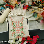 Light beige designer premium silk cotton unstitched salwar material, peachish pink floral embroidered on yoke(thin fabric, lining needed)matching drum dyed lining provided, NO BOTTOM, abstract printed semi linen dupatta. CODE FB251512