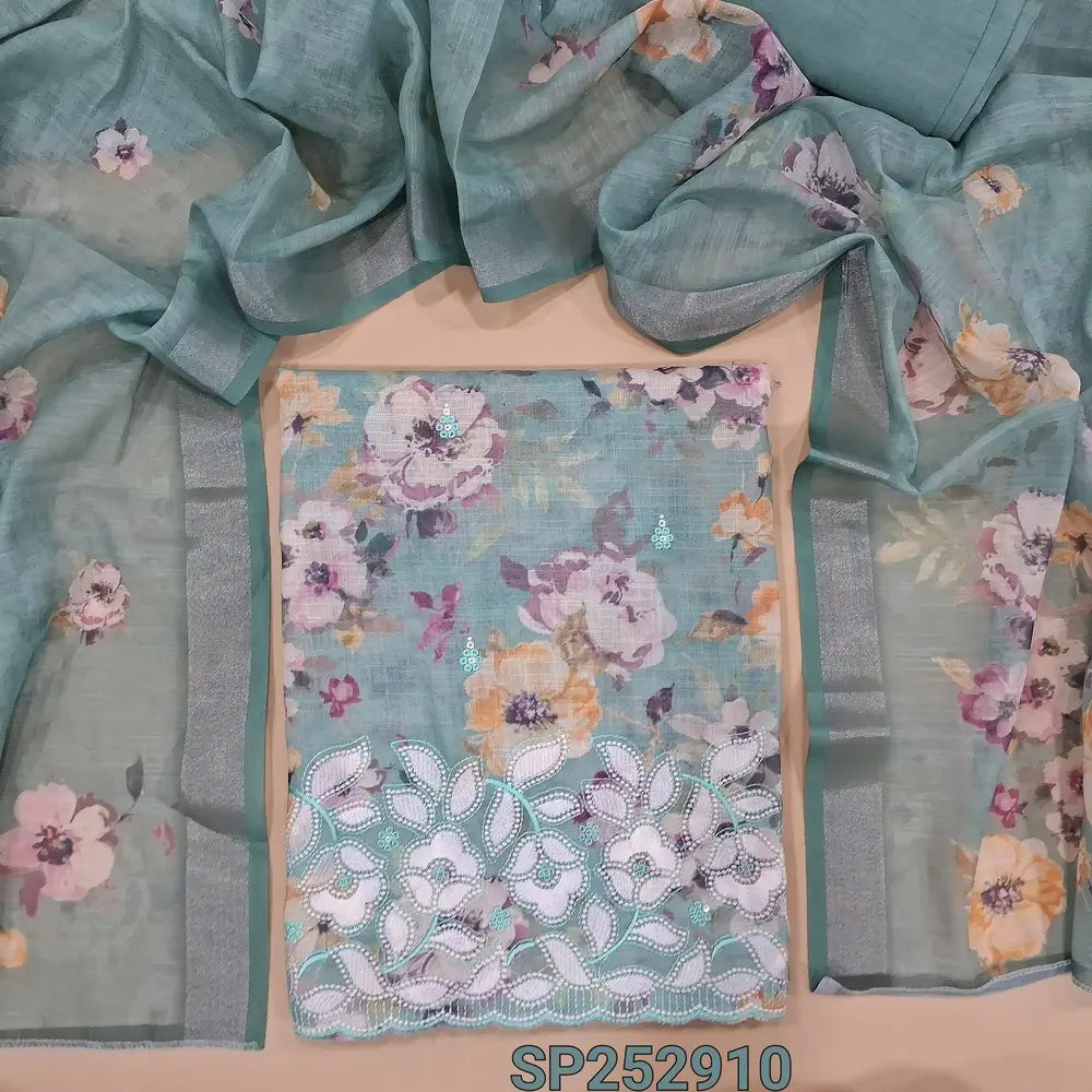 Light Blue printed semi linen unstitched salwar material, embroidery on front and daman (Textured, Lining Needed) Matching Santoon Bottom, Printed semi linen dupatta. SP252910