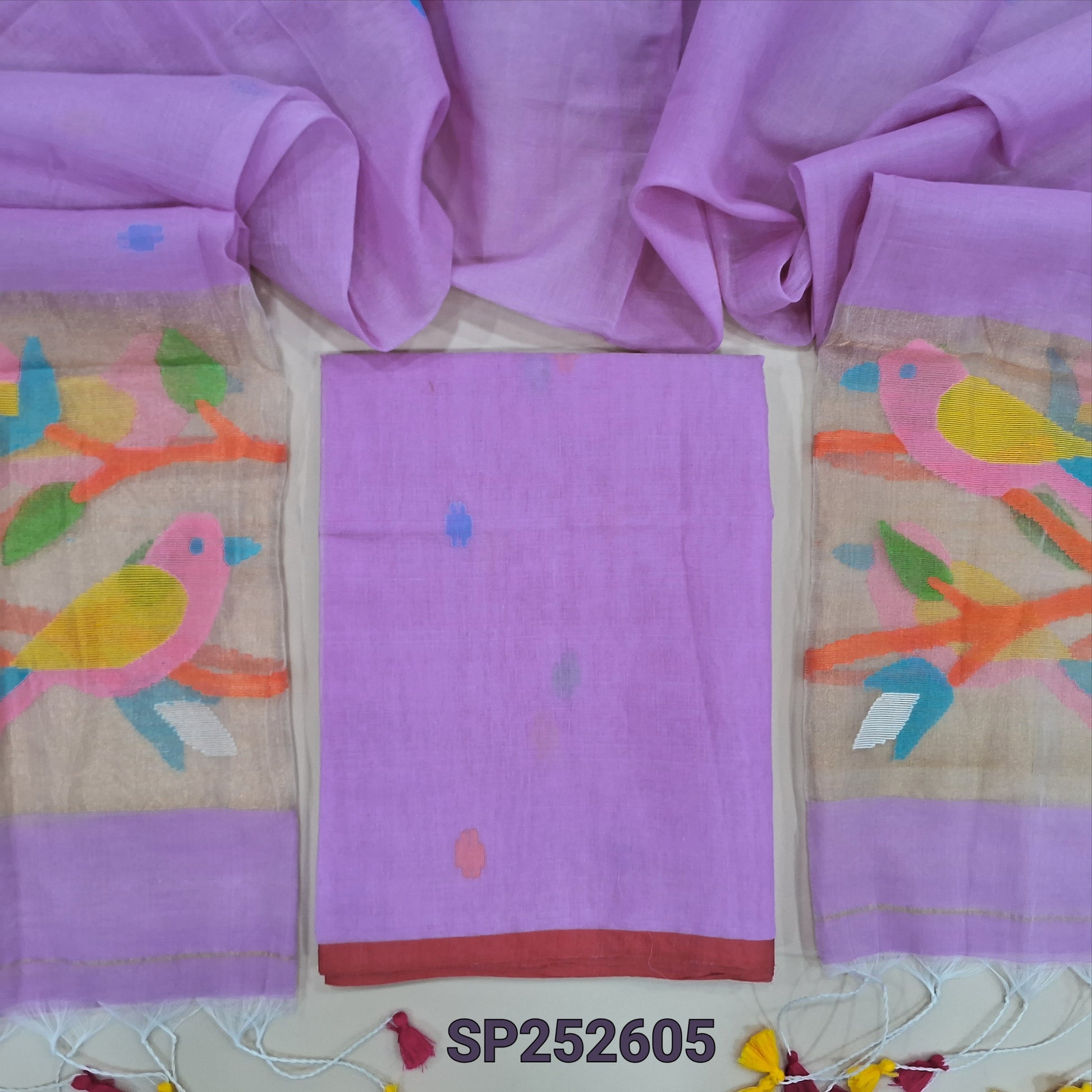 Light Purplish Pink muslin jamdani unstitched salwar material, hand woven design all over(thin, lining needed)NO BOTTOM,hand woven muslin jamdani full length dupatta with rich paithani weaving pallu& hand made tassels. SP252605